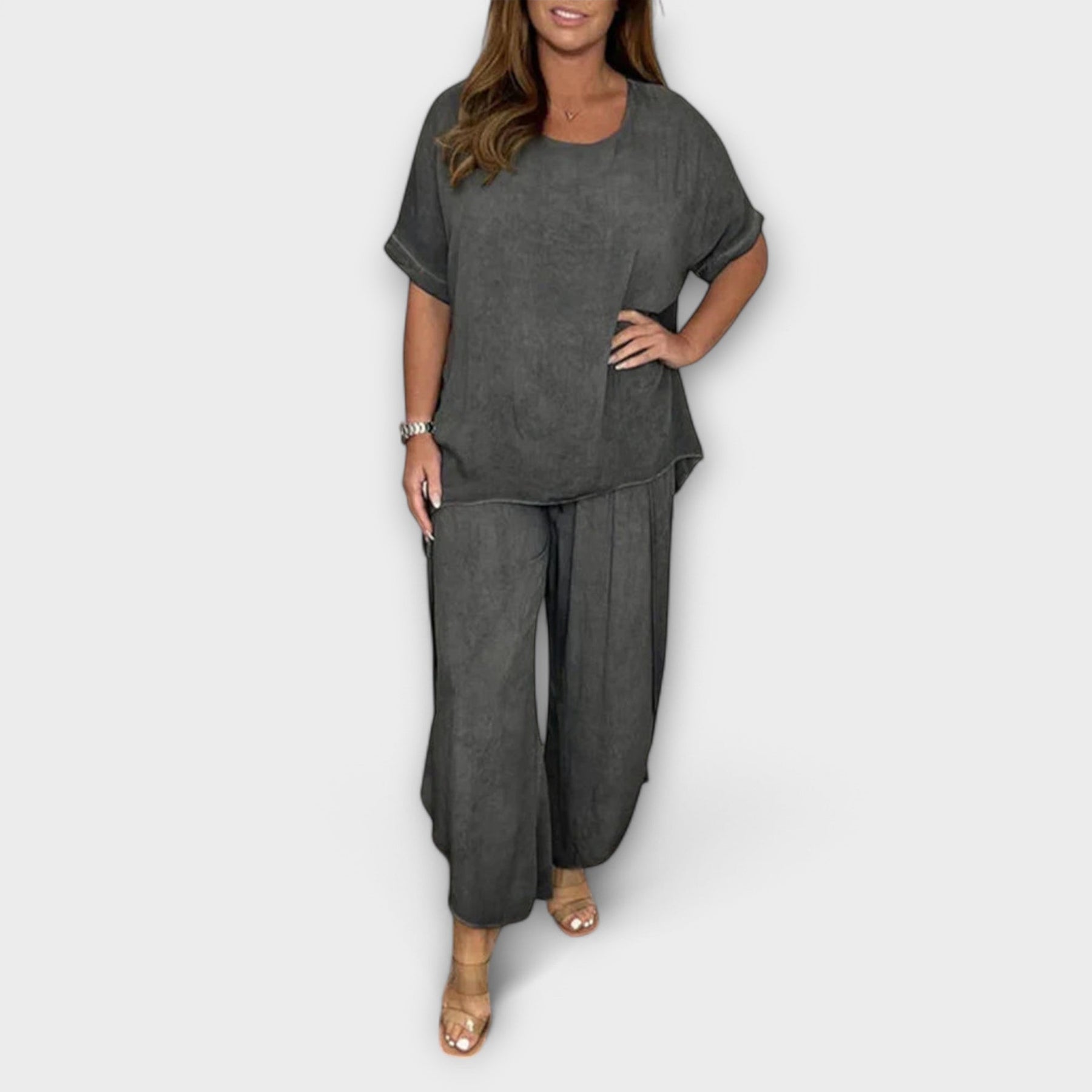 Objavte náš pohodlný a uvoľnený dvojdielny set, ktorý spája jednoduchú eleganciu s maximálnym komfortom. Perfektný na každodenné nosenie, tento set kombinuje voľnú blúzku s ležérnymi dlhými nohavicami – ideálne na jar, leto a jeseň.